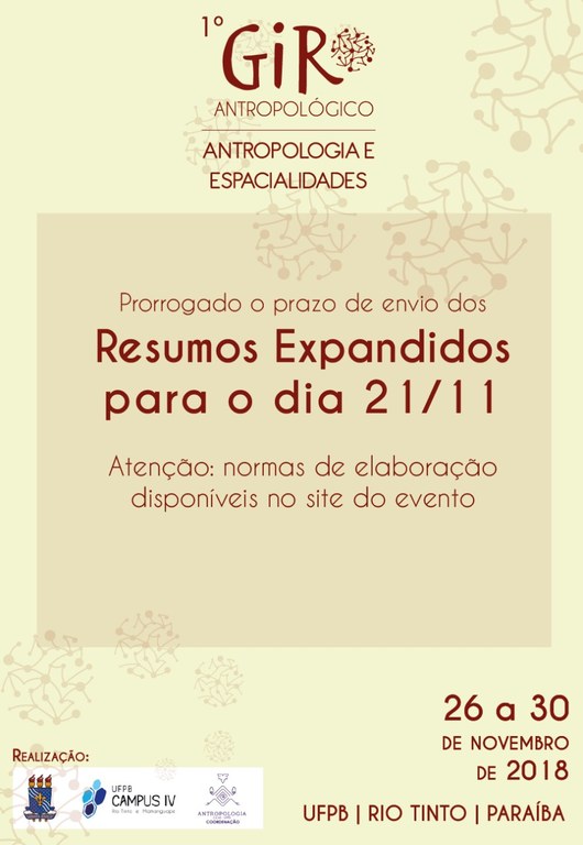 Você está aqui: Página Inicial > Contents > Notícias > Prorrogado o prazo de envio de Resumos Expandidos para o 1°Giro Antropológico para o dia 21/11.