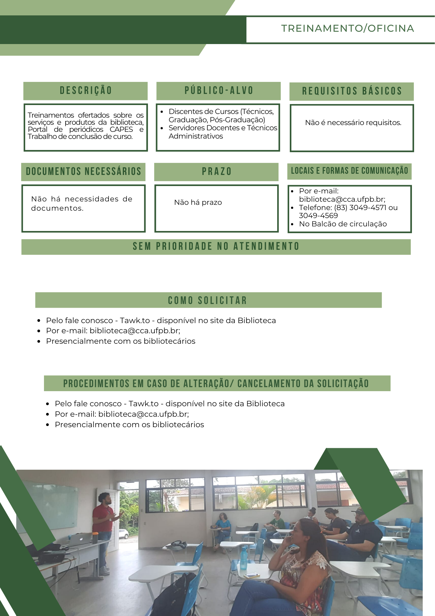 Descrição da imagem: Imagem com fundo branco de detalhes verde claro e verde escuro. Título: Treinamento/Oficina. Logo abaixo quadros com as seguintes informações: Descrição - Treinamentos ofertados sobre os serviços e produtos da biblioteca, Portal de periódicos CAPES e Trabalho de conclusão de curso. Público alvo - discentes de cursos (técnicos, graduação, pós- graduação), servidores, docentes e técnicos administrativos. Requisitos básicos - não são necessários requisitos. Documentos necessários - não há necessidade de documentos. Prazo - não há prazo. Locais e formas de comunicação: Por e-mail: biblioteca@cca.ufpb.br; Telefone: (83) 3049-4571 ou 3049-4569; e no balcão de circulação. Logo abaixo está escrito: sem prioridade de atendimento. Como solicitar: Pelo fale conosco - Tawk.to - disponível no site da Biblioteca, presencialmente com os bibliotecários e por e-mail: biblioteca@cca.ufpb.br. Procedimentos em caso de alteração/ cancelamento da solicitação: Pelo fale conosco - Tawk.to - disponível no site da Biblioteca, presencialmente com os bibliotecários e por e-mail: biblioteca@cca.ufpb.br. No rodapé está uma foto dos discentes com o professor em sala de aula.