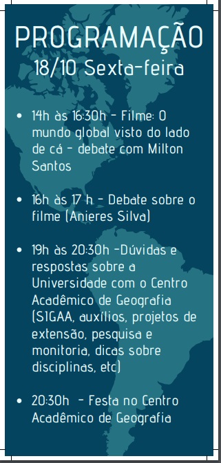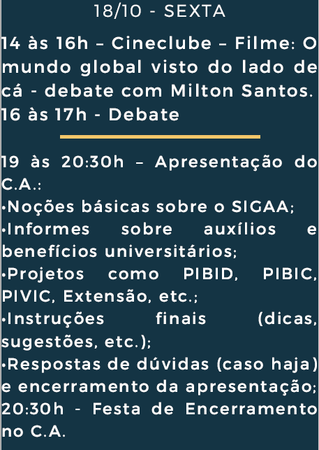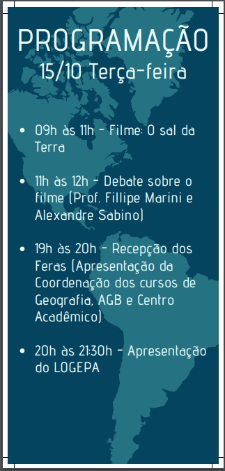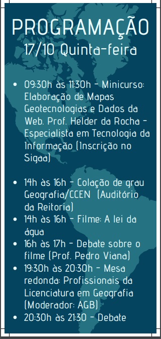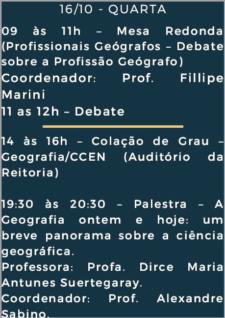 | 11/10/2019 | SEMAGEO - Semana de Geografia |