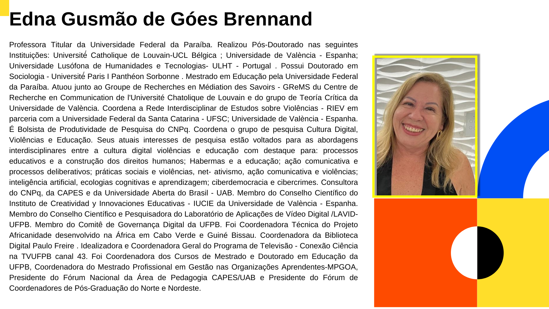 Professora Titular - Pós-doutorado Universitat de València, UV, Espanha; 2018-2020 - Pós-Doutorado Universidade Lusófona de Humanidades e Tecnologias, ULHT, Portugal; 2011-2012 - Pós-Doutorado Université Catholique de Louvain, UCL, Bélgica. 2004-2005