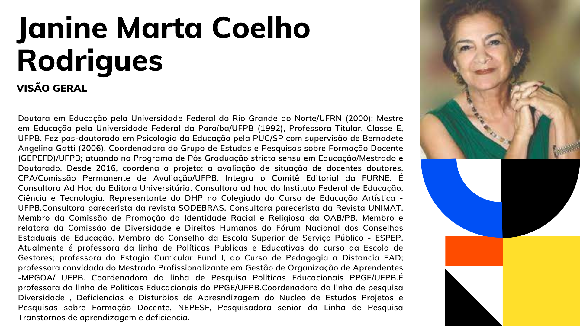 - Áreas de interesse: Integra o Grupo de Estudos de Políticas do Ensino Superior, vinculado ao Núcleo de Estudos de Pesquisas em Educação e Sociedade - CE/UFPB. É associada a Rede Universitas-BR, Fineduca, ANPAE. É representante dos professores do Centro de Educação, no Conselho Superior de Ensino, Pesquisa e Extensão - CONSEPE-UFPB.