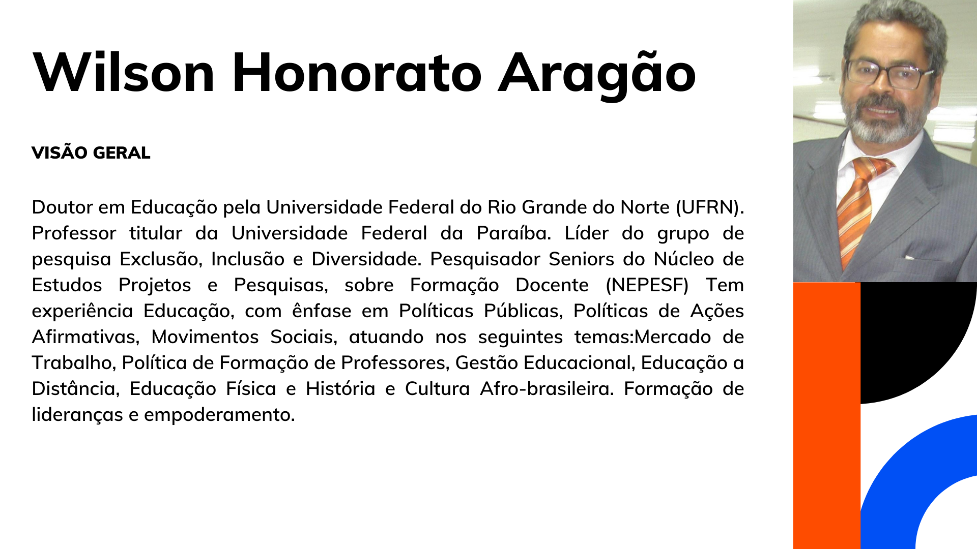 - Áreas de Interesse: Educação das relações étnico-raciais; raça e suas interseccionalidades; Pedagogias anticoloniais, de(s)coloniais e contracoloniais; Descolonização curricular; Movimento Negro educador. Antirracismo e formação docente. Leis 10.639/03 e 11.645/08.