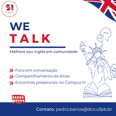 O grupo We Talk, liderado por nosso aluno Pedro Vinícius, tem como objetivo reunir discentes que queiram aprender inglês em comunidade com foco em conversação. Além de encontros presenciais, dicas serão compartilhadas em grupo de whatsapp.